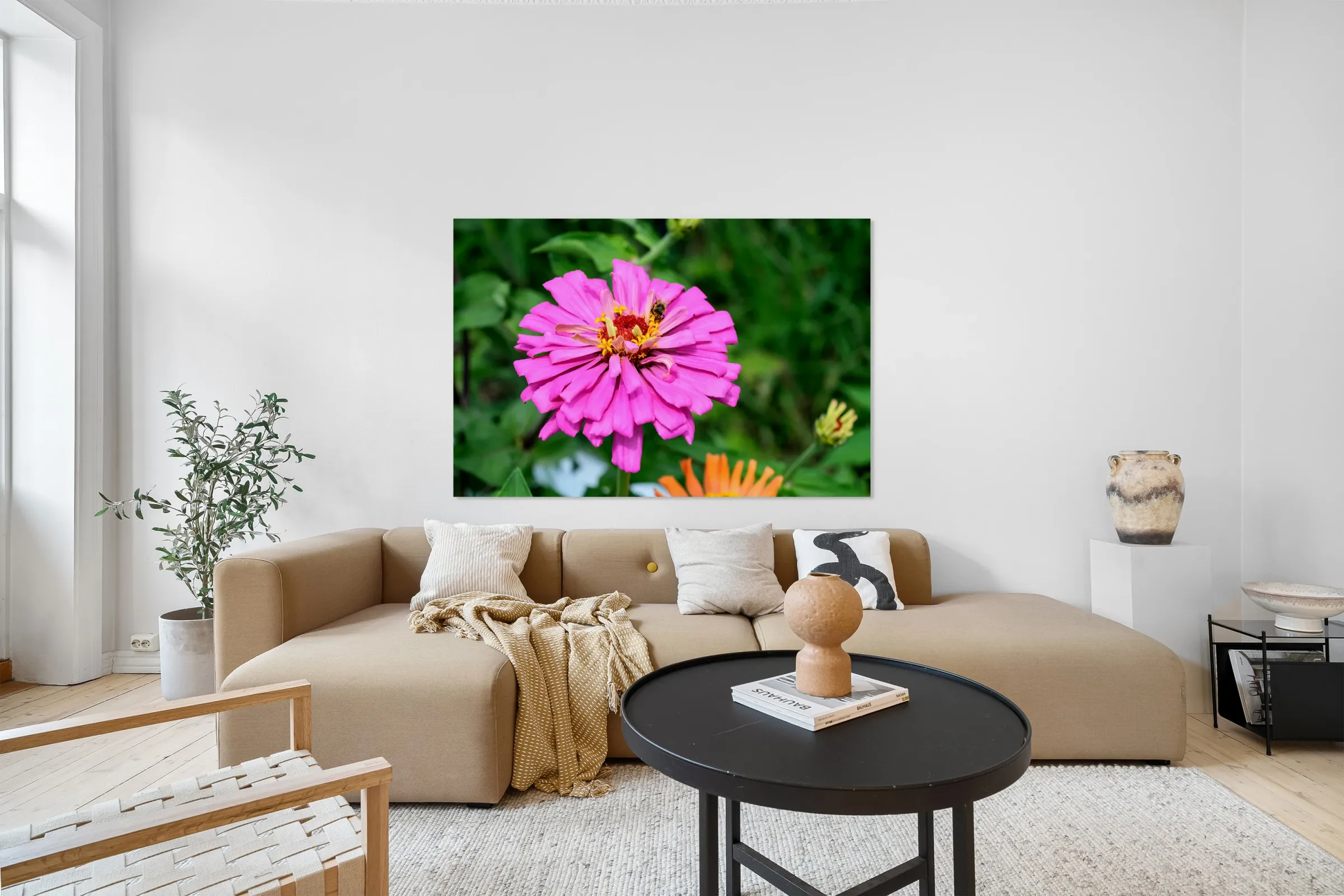 The majestic zinnia stands tall in vivid pink, drawing in a single bee busy, unnoticed, yet essential. Each petal curls outward like an unfolding scroll, telling stories of summer sun and buzzing rituals. The depth of color contrasts with the bee’s delicate wings, creating a portrait of ecological intimacy and seasonal abundance. This artwork whispers of interdependence. It’s not just a flower or an insect, it’s a moment of purpose captured in stillness. Hang it where you want to reflect on quiet contributions, on the unseen labor that sustains joy, and the grace of the unnoticed.