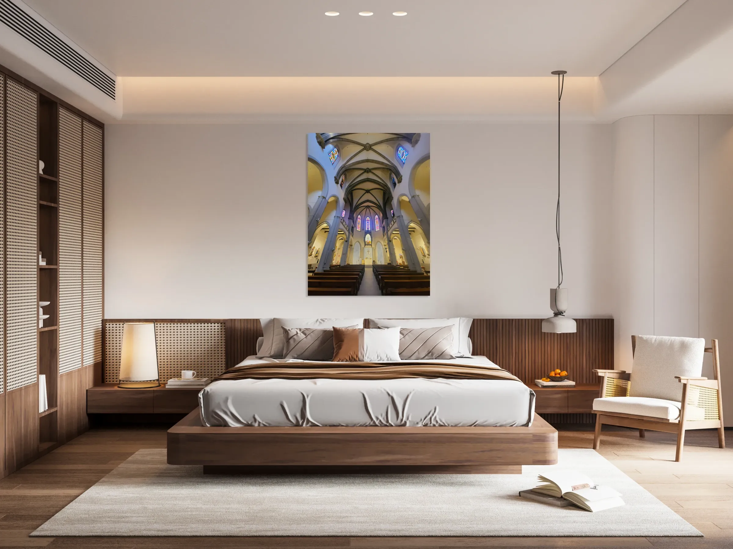 This piece captures the soul of an old church, the moment just before a prayer is whispered. The upward sweep of the architecture, married with the soft embrace of multicolored light through stained glass, envelops the viewer in wordless worship. “The Vault of Unspoken Prayers” is where stone and spirit meet. It transforms your space into one of quiet power. Hang it in entryways, sacred nooks, or workspaces to subtly remind you that presence and peace often exist in stillness and grace.