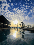 A golden sun kisses the horizon as the sky bursts into a mosaic of clouds, casting a mesmerizing pattern above a peaceful pool. Silhouettes of palm tr...[+]