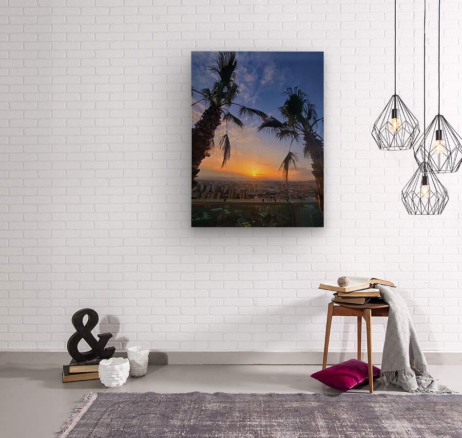 The golden sun drifts downward, casting its last light between two resilient palms. Beneath it, a city exhales under twilight’s spell. This photograph invites the viewer to breathe with the city—one last inhale before nightfall, one last golden gift from the day. A tranquil bridge between the exotic and the urban, this image is perfect for meditation rooms, lounges, or any interior needing calm energy. It evokes stillness without emptiness—a thoughtful pause in the world’s rush.