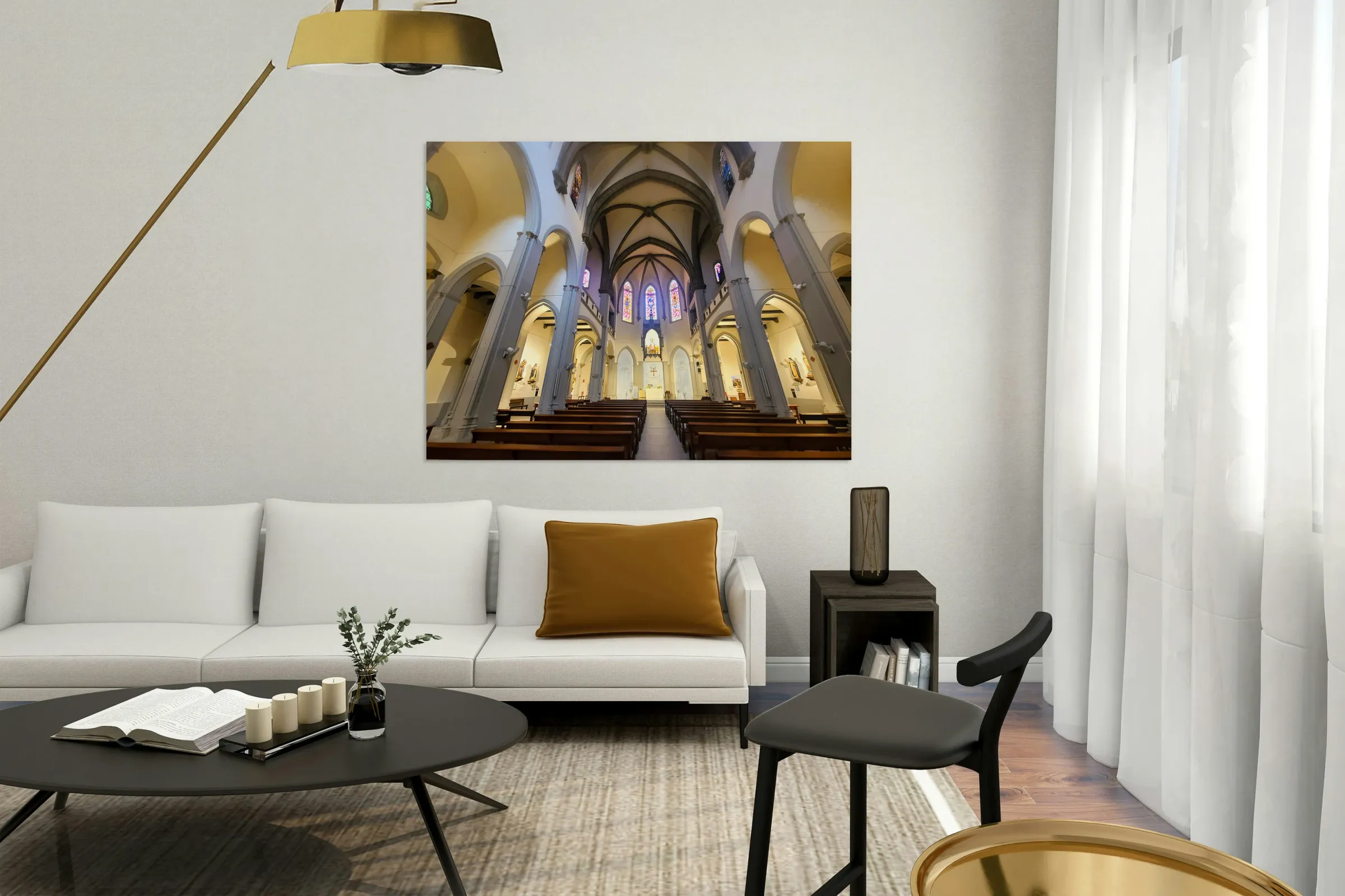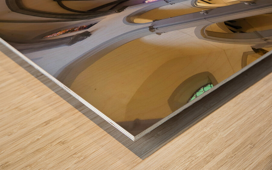 This image channels the divine interplay of space and light found within a centuries-old cathedral. Vertical columns suggest unwavering faith, while beams of colored light from the stained glass windows streak across the interior like threads of grace. As a wall piece, it speaks to both strength and stillness—perfect for reflective spaces, meditation rooms, or creative studios that benefit from a touch of historical soul and architectural drama. It is both a grounding and uplifting presence in any space.
