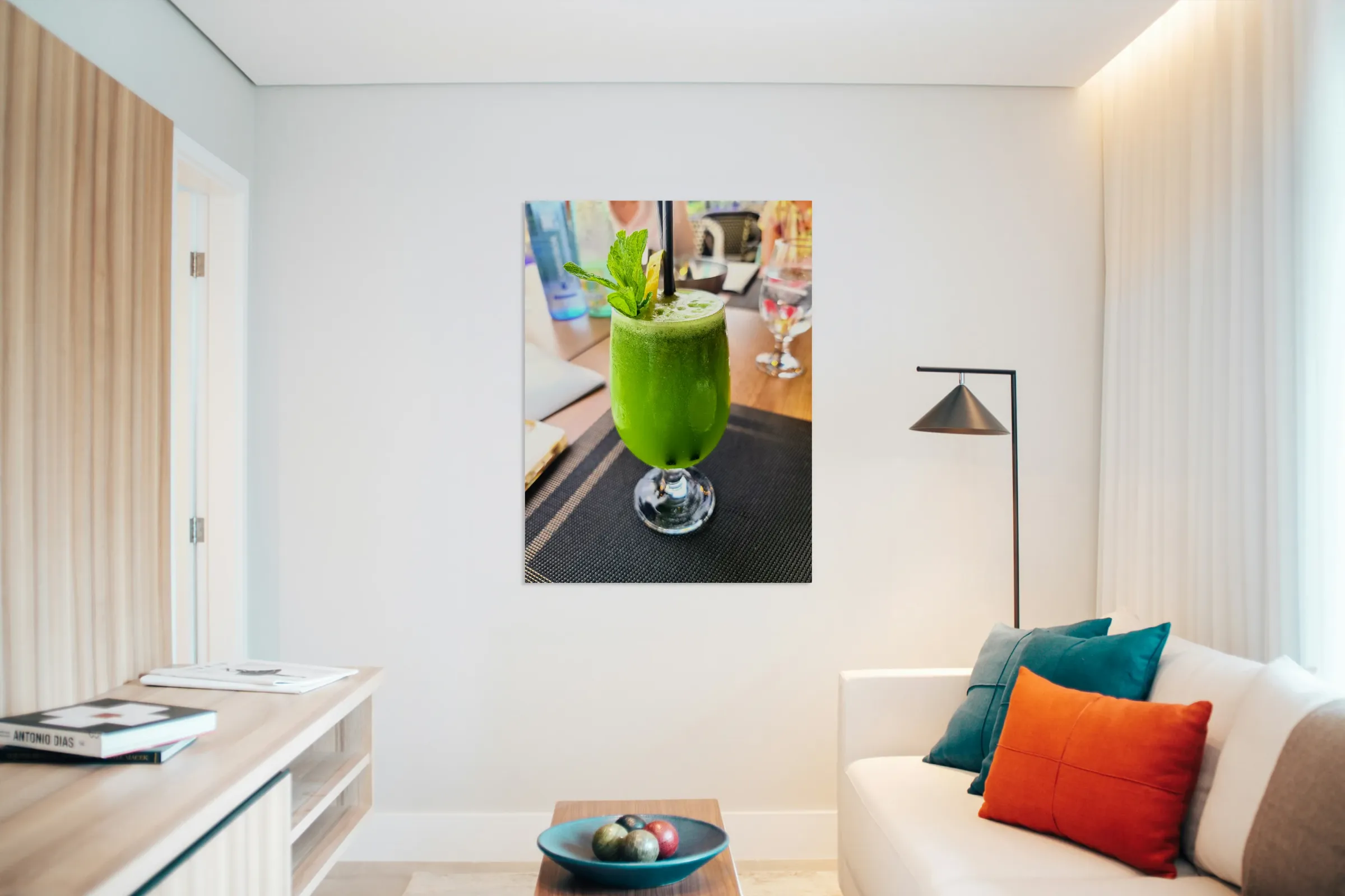 An explosion of nature’s flavor and color captured in a single moment. The lush green drink bursts with garden-grown energy — fresh mint, citrus brightness, and herbal complexity. This photo embodies the essence of botanical living, where every ingredient tells a story and every sip is an act of self-care. This piece transforms kitchens, cafés, or health-focused interiors into vibrant sanctuaries. It energizes the viewer with a feeling of movement and growth, making it ideal for spaces rooted in nourishment, creativity, and nature-inspired design. “Botanic Burst” is not just décor — it's an homage to the flavors of life.