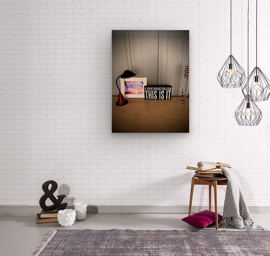 This photograph captures a clean and cozy workspace featuring a motivational sign that reminds you to take that leap: “THIS IS IT.” With a vibrant painting of a sunset sky glowing in the background, and warm lighting casting soft shadows, the image radiates purpose and possibility. Whether you're decorating a study nook or curating content around daily inspiration, this photo blends art, encouragement, and ambiance.