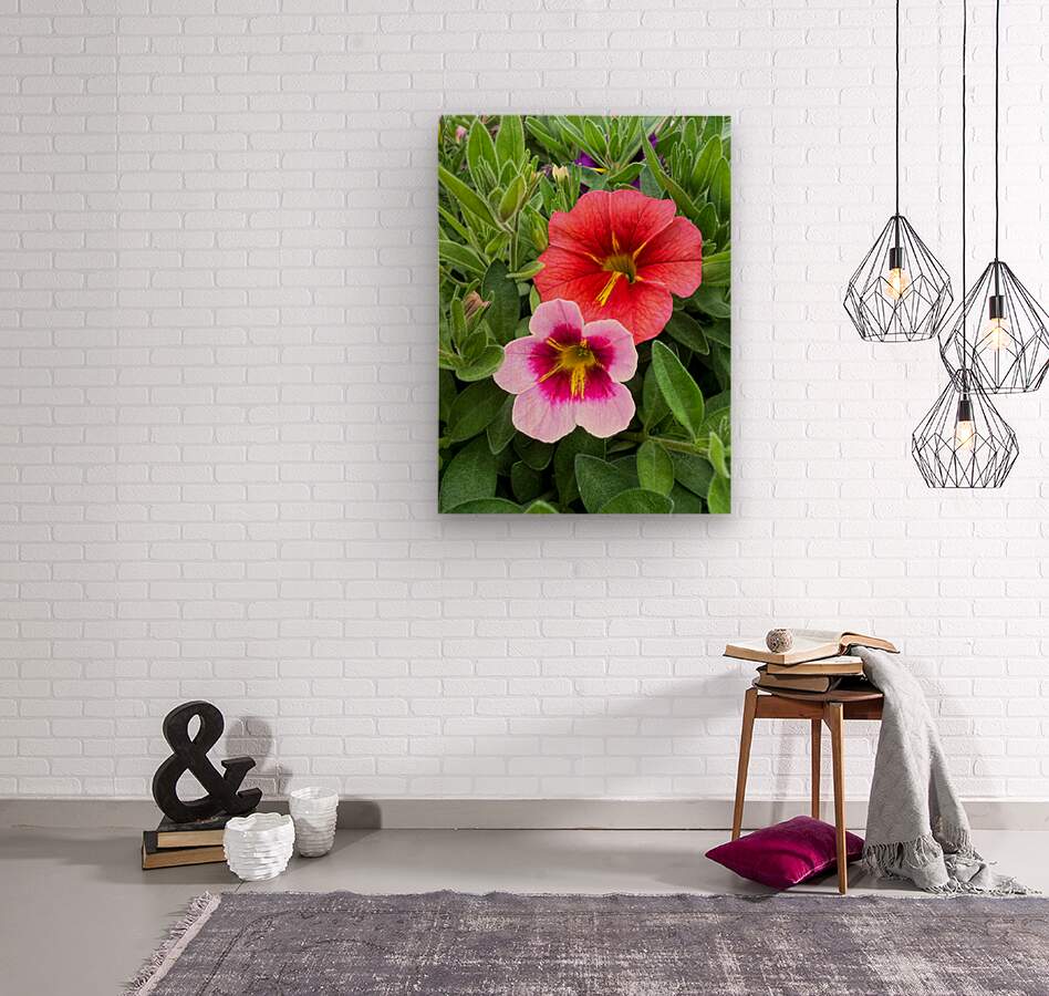 A celebration of nature's expressive voice—two vibrant petunias, performing in visual harmony. Like vocalists in a duet, one sings in bold crimson, the other in delicate pink, yet together they create a radiant, balanced melody. Surrounded by vivid greenery, their contrast amplifies their unity, making this image feel both spontaneous and composed. This piece infuses spaces with energy and creativity. Ideal for eclectic rooms, studios, or bright hallways, it delivers both aesthetic delight and emotional resonance. Let this floral duet bring music to your walls.