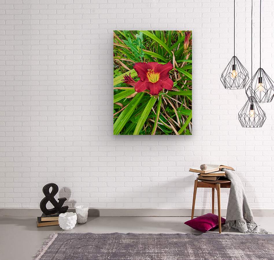 Captures the striking elegance of a deep red daylily in full bloom. As wall art, it symbolizes passion and energy, infusing any room with warmth and natural vibrance. Its bold petals framed by lush green foliage offer a refreshing and powerful visual centerpiece.