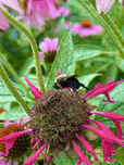 Captures a poignant and poetic moment near the close of the blooming season. A lone bumblebee clings to a fading Monarda (bee balm) flower, its once-b...[+]