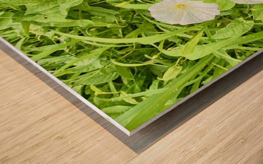 This image showcases the humble beauty of bindweed flowers glistening with dew among vibrant foliage. This piece adds a tranquil, pastoral elegance to any space, a celebration of nature’s quiet moments.