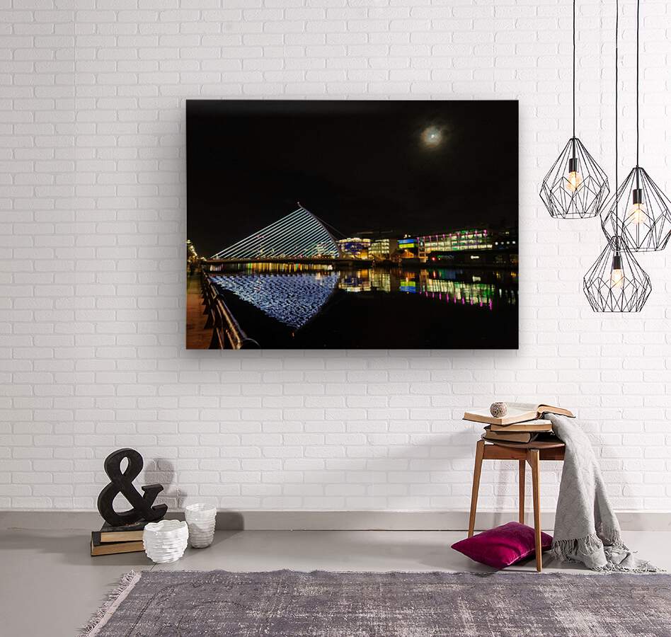 Dreams of Dublin Series. The hustle and bustle of Ireland's business center along River Liffey glimmers peacefully at night. This architecturally unique modern bridge is as beautiful at night as it is during the day time.
