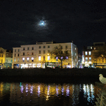 Dreams of Dublin Series. The hustle and bustle of Ireland's business center along River Liffey glimmers peacefully at night. This little seagull pensively looks up to the glimmer of moonlight that peeks through the rolling clouds.