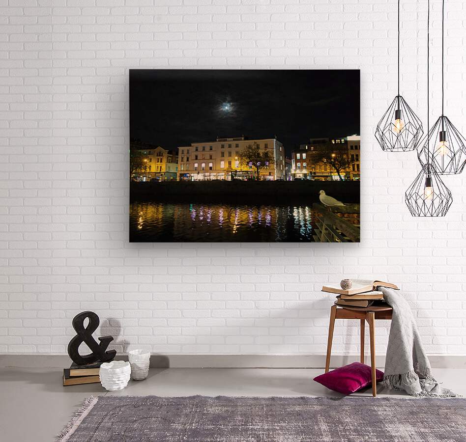 Dreams of Dublin Series. The hustle and bustle of Ireland's business center along River Liffey glimmers peacefully at night. This little seagull pensively looks up to the glimmer of moonlight that peeks through the rolling clouds.