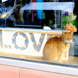 A ginger cat rests beside a glowing "LOVE" sign, nestled in a shop window, quietly surveying the outside world. This image captures the juxtaposition ...[+]