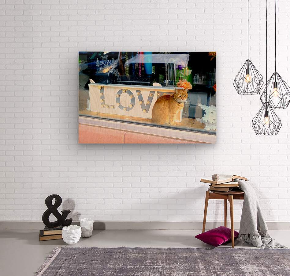 A ginger cat rests beside a glowing "LOVE" sign, nestled in a shop window, quietly surveying the outside world. This image captures the juxtaposition of warmth and curiosity man's indoor sanctuary against the vibrant street life beyond. Perfect for living spaces or reading nooks, it speaks to the contentment found in stillness and the quiet joy of observation. A lovely homage to everyday beauty and unexpected companionship.