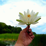 A single, radiant white water lily is gently lifted by hand against the vast backdrop of a vibrant wetland; an offering not just from the earth, but a...[+]