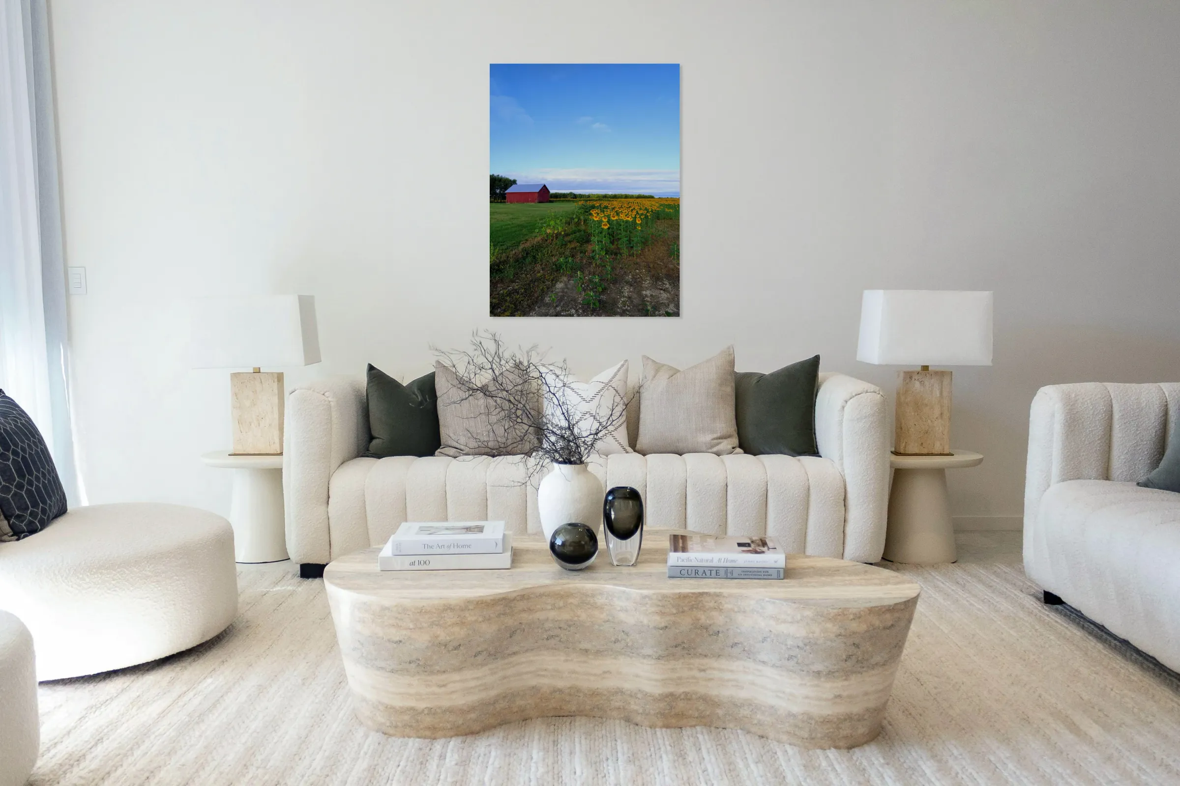 Sunflower Collection. Came across the sunflower farm on a road trip in 2023 in Indiana. The field of sunflowers was like a carpet of sunshine! In this image the loudest voice belongs to the land. This minimalist landscape invites the viewer into a moment of absolute calm a horizon bathed in sunlight, filled with rows of sunflowers, all beneath an endless blue sky. The barn, while bold in color, does not dominate but rather complements the field’s rhythm. It is a visual poem to quietude and mindfulness. As wall décor, it suits minimalist, modern, or nature-inspired interiors where space and mood matter more than detail. A meditative piece perfect for bedrooms, yoga studios, or anywhere peace is prized.