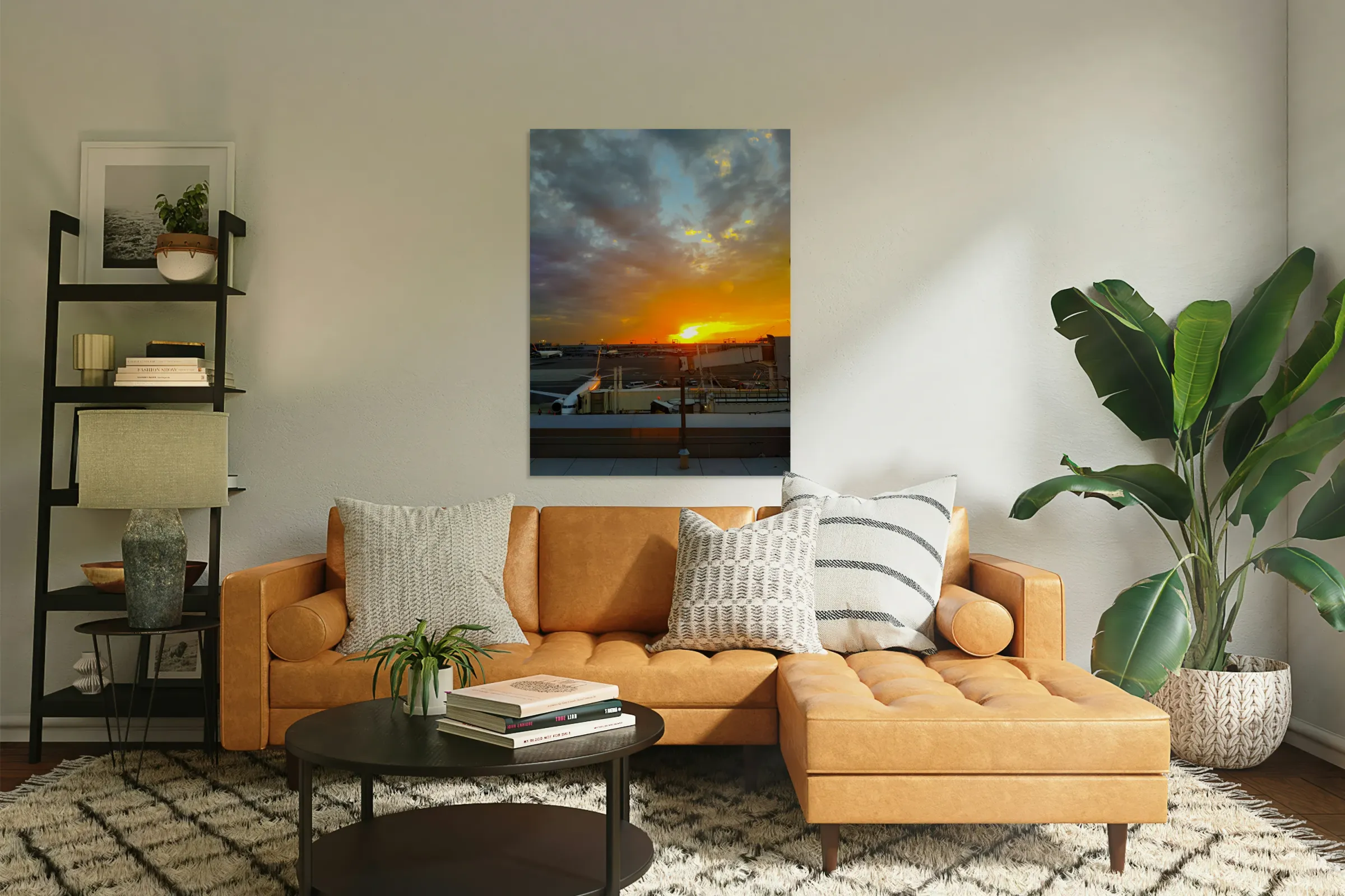 This was taken at the Delta Sky Club at JFK Airport. New York City Collection. A radiant sunset reflects over the tarmac at one of the world’s busiest airports. The dramatic cloud cover and glowing horizon symbolize transition and movement, making this a meaningful piece for travelers and dreamers alike. Ideal for home or office spaces that crave energy and light.