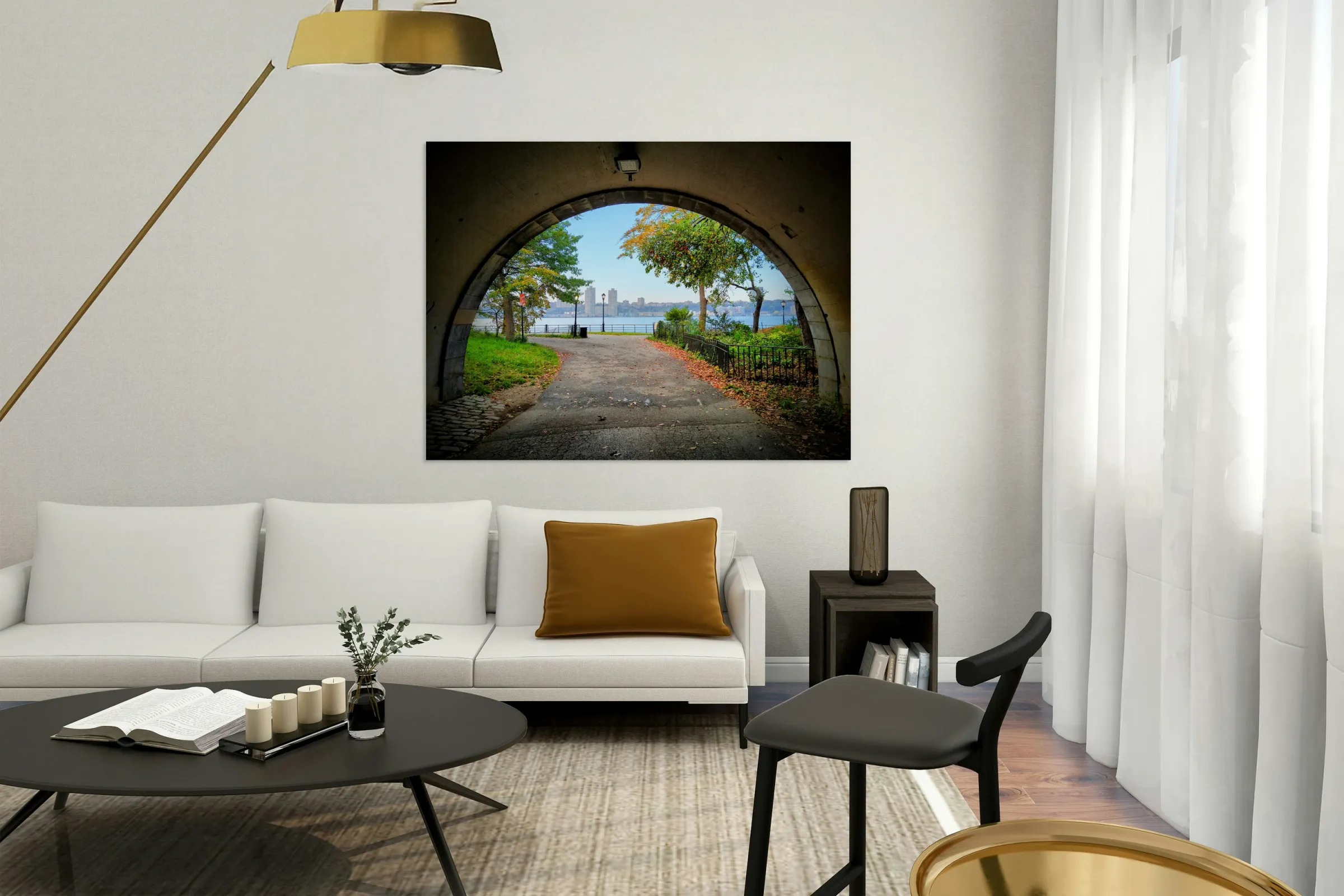 Riverside Park View of Twin Towers in New Jersey. Riverside Park Collection. Soft autumn hues and sharp lines create a harmonious contrast as the tunnel opens into nature’s calm. The photograph celebrates the quiet in-between moments, the pause before entering a new view. A thoughtful and aesthetic addition to any home or office art wall.