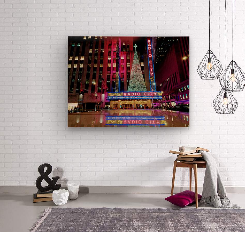 New York City Collection. This vibrant night photograph captures the iconic Radio City Music Hall in New York City aglow in festive colors, crowned by a towering Christmas tree. The wet pavement reflects the neon brilliance and creates a mirror-like visual harmony, making it a captivating representation of NYC’s holiday spirit. Ideal as a statement piece, this wall art brings the charm, energy, and grandeur of the city into any room.