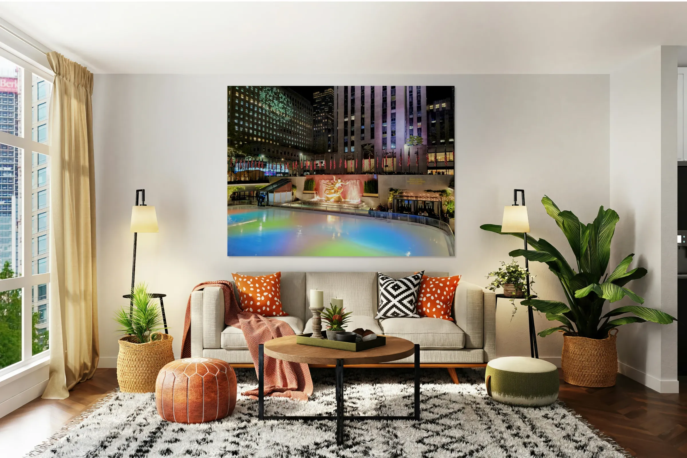Rockefeller Center Rainbow Ice Rink .New York City Collection This captivating nightscape captures the iconic Rockefeller Center ice rink in New York City, illuminated by vibrant rainbow lighting across its icy surface. The golden Prometheus statue glows under the soft shimmer of festive lights, creating a magical winter ambiance. As wall art, this piece brings the essence of New York’s holiday charm into any space, celebrating joy, color, and the energy of a world-famous landmark.