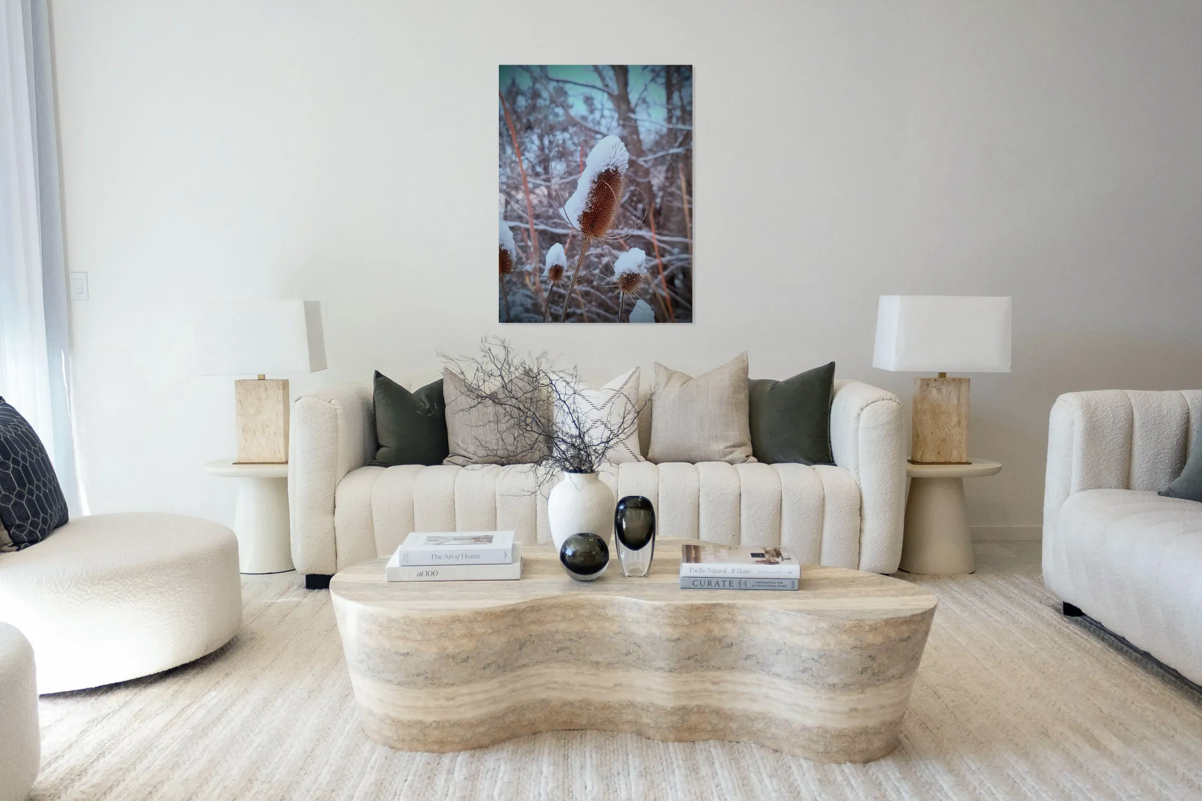 Nature plays sculptor in this photograph of a snow-topped thistle resembling a whimsical frozen treat. The humorous shape contrasts beautifully with the natural textures of the wild plant, making it an eye-catching and unexpected piece of winter wall art that brings subtle fun to modern, rustic, or eclectic interiors.