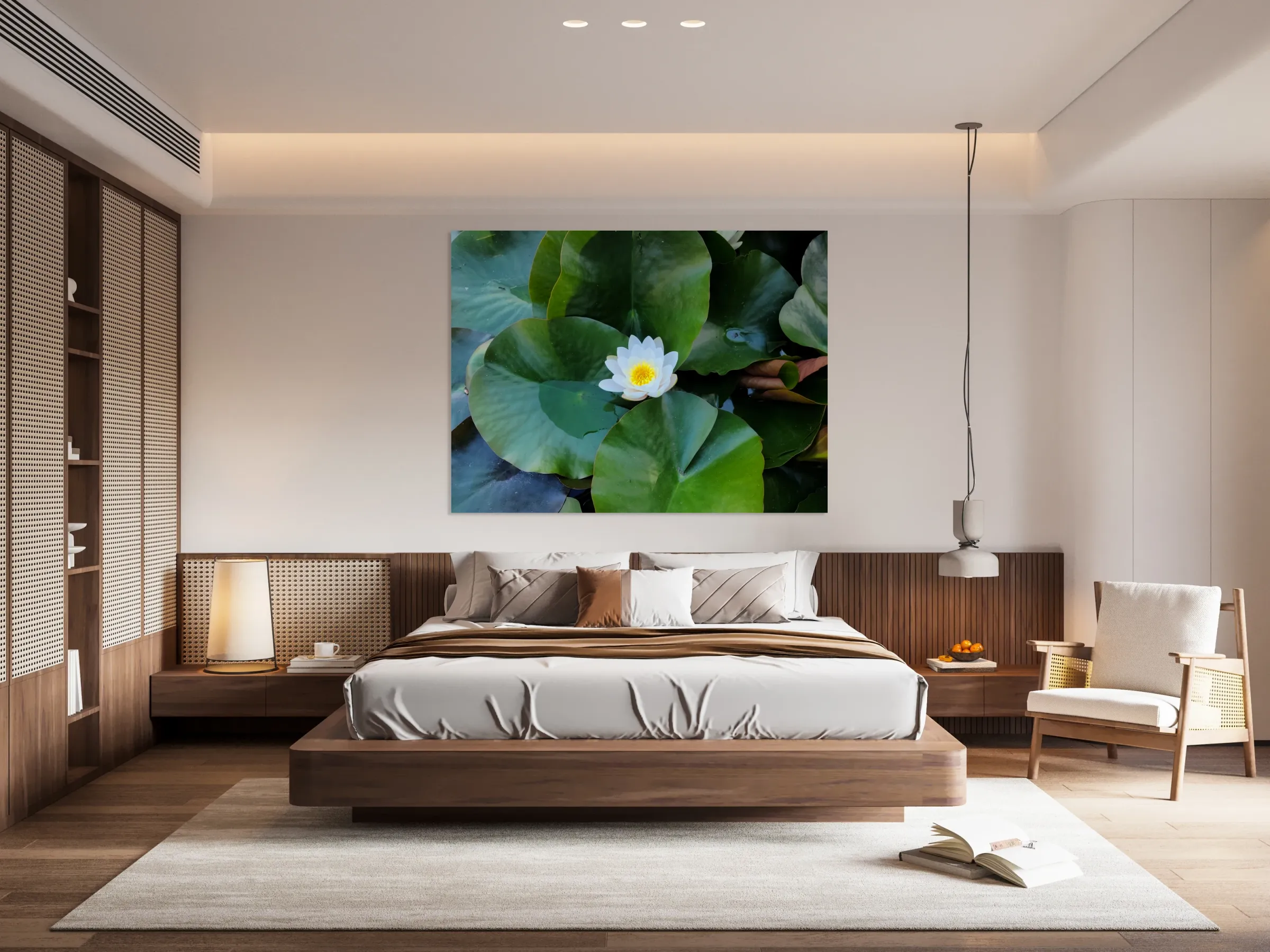 Nestled in a sea of emerald leaves, a single white water lily opens its heart to the morning sun. Photographed in a natural pond, this piece captures a fleeting, sacred second in time, a moment of awakening and stillness coexisting. It's a celebration of nature’s quiet offerings, and the symmetry of impermanence and purity. As wall art, this photograph brings the viewer into a reflective space ideal for meditation rooms, reading nooks, wellness centers, or minimalist interiors. Its calm, centered composition helps anchor any space in a feeling of peace. The lone bloom is a metaphor for resilience and inner light, reminding us that even in stillness, growth and beauty persist.