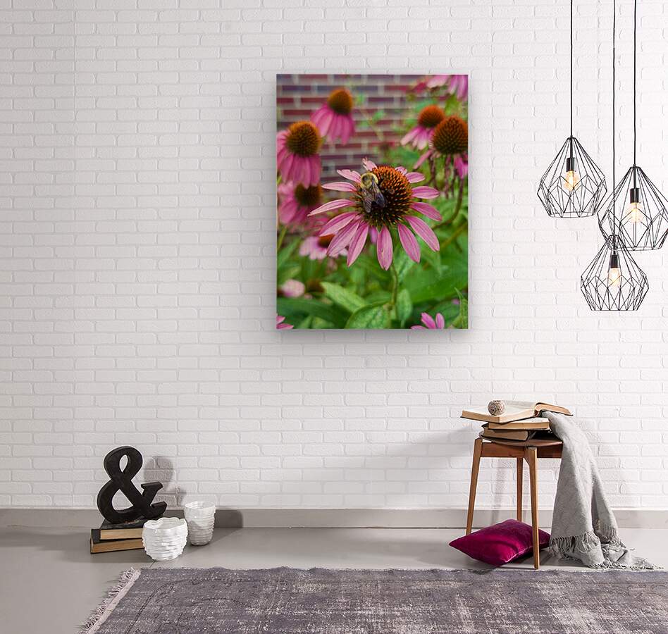 Captures the delicate balance between flora and fauna. A bumblebee rests atop a vivid pink coneflower, bringing a sense of tranquility and connection to nature. This wall art is perfect for evoking a peaceful garden atmosphere in your space.